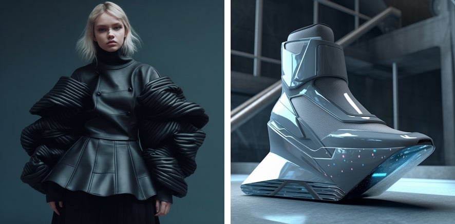 今回、ファッションブランド「accelerando.Ai」より販売開始したアイテムは2点です。1点目は今年6月に開催され、120通以上の応募があったデザインコンテスト「accelerando.Ai - AI FASHION CHALLENGE #2」で選ばれたデザインをベースにしたシューズアイテムと、メタバース空間のアイテムだからこそ実現できた、腕のデザインが特徴的なウェアです。