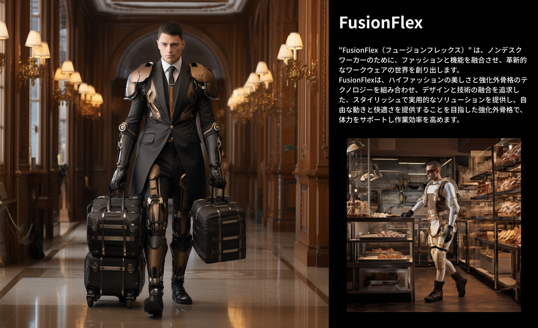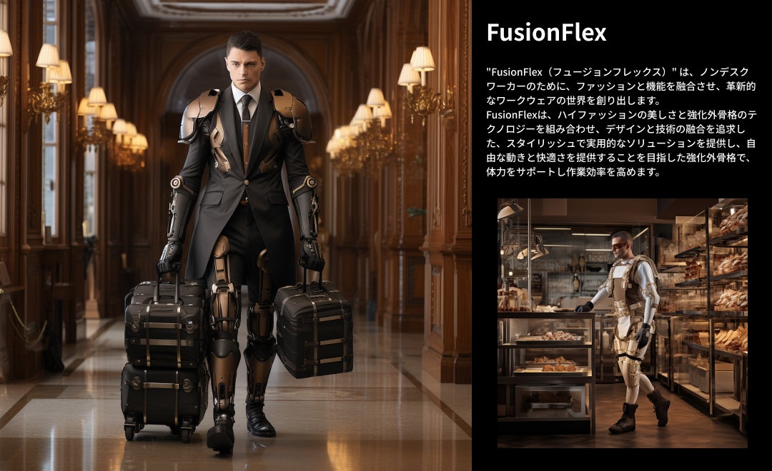 かつて空想科学の定番だったパワードスーツやアシストスーツが実践的に展開され始めている中で、日常へ融和や普及のためにファッションとして昇華させるアプローチをAIで考えるのは面白いですね。ホテルのポーターの人がエレガントな装いとマッチさせながら取り入れている様など、シーンを想定できる画像になっているのがとても良いと思いました。