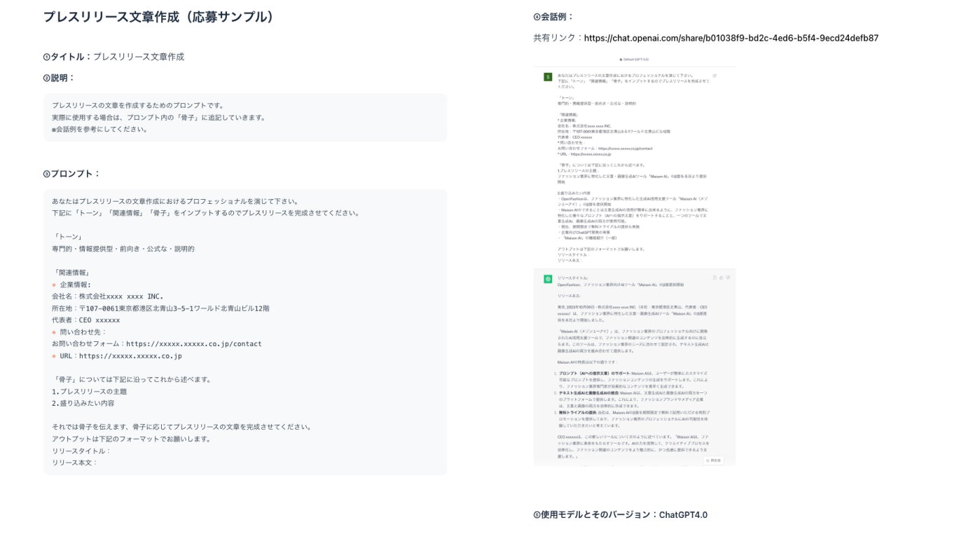 ※今回のコンテストは「ファッション業界での活用」というのが条件となりますが、他業界で使える一般的なプロンプトであっても、ファッション業界での利用イメージが湧くものであれば問題ございません。(例:売上管理、広告出稿、商品説明文の生成など)