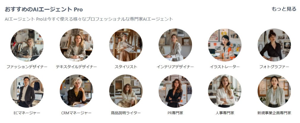 ”AIエージェント”とは、AIに特定の職種を設定することで前提知識が必要な質問でも、より精度の高い回答を得ることができる機能です。今回のリニューアルでは人事やPR専門家などだけでなく、ファッション業界に特化したMaison AIならではの、ファッションデザイナーや商品説明ライターなどのAIエージェントもご用意。基本的な専門知識を身につけた状態のAIエージェントを提供しているので、AIの設定をする必要はありません。