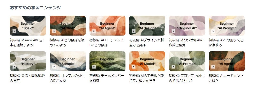 「Maison AIの基本を理解しよう」から、「AIとの会話をはじめてみよう」「プロンプト(AIへの指示)とは?」など、Maison AIの画面を通してAIの基礎知識が学べるテーマにも触れた各1分程の動画です。こちらはサービス利用者に向けてまず最初に見ていただきたい内容が盛り込まれたコンテンツとなっています。