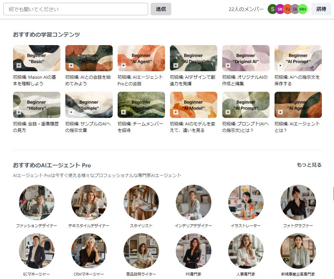 日本国内でも生成AIへの関心が高まるにつれて、その利用者数も増加傾向にある一方で、これまでユーザーからは、「AIで何ができるのかわからない」「上手く使いこなしたいけど、まず何をすればいいのだろう…」などの悩みが寄せられていました。そこで多くの方にAIを気軽に活用していただくために、今回のリニューアルでは比較的初心者のユーザーに向けて、Maison AIの使い方を説明した動画コンテンツや、専門的な知識を持つAI(AIエージェントPro)などをご用意。ユーザーが直感的で分かりやすい操作ができるようにデザインしました。