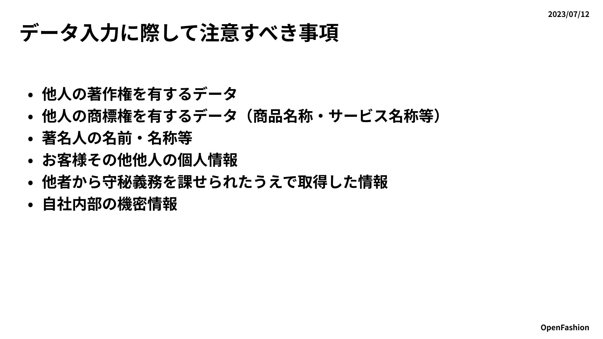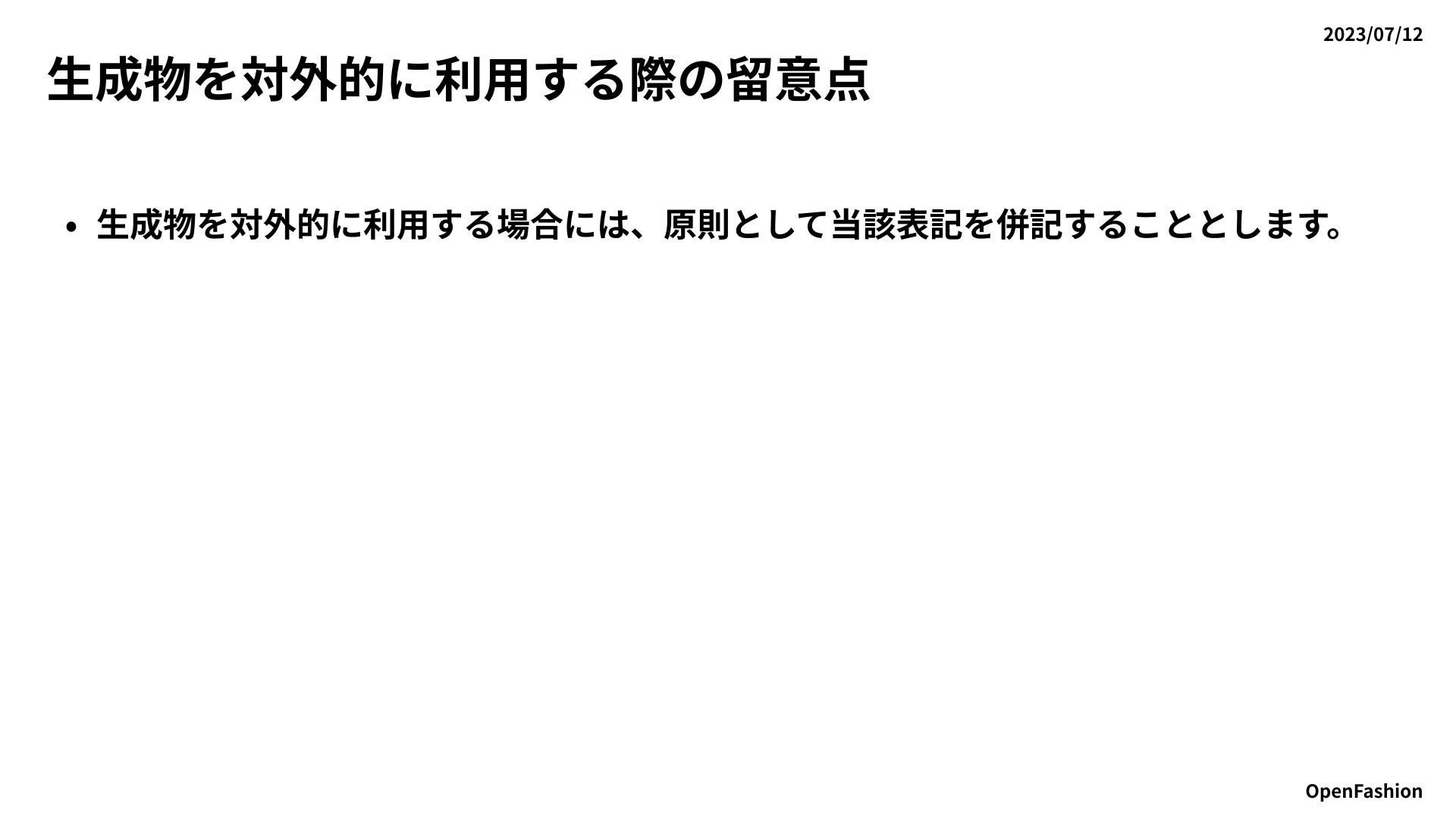 など、生成AIを活用するにあたって疑問や話題に挙がりやすい項目を、現在日本に存在する法律を加味しながら「OpenFashion GAI Playbook」に盛り込みました。