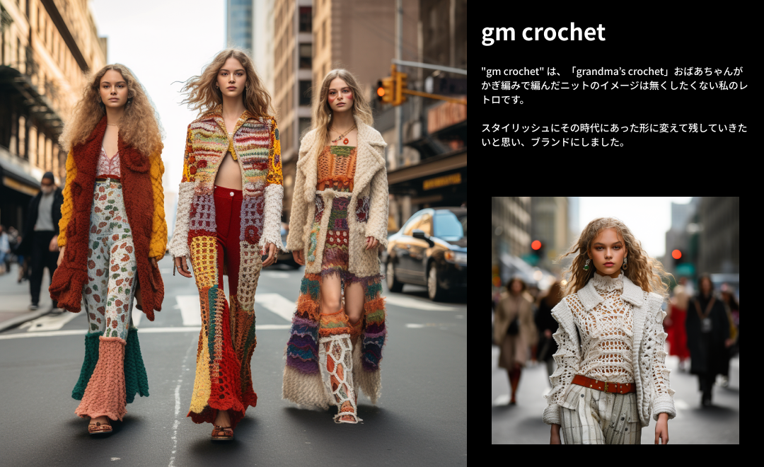 かぎ編みというテクニックに注目し、シンプルなプロンプトから多様なスタイリングを生み出している部分が面白いです。その懐かしさや温かみの中に、今を感じるエッセンスを加えて新しいスタイルに昇華できている点も良いと思いました。