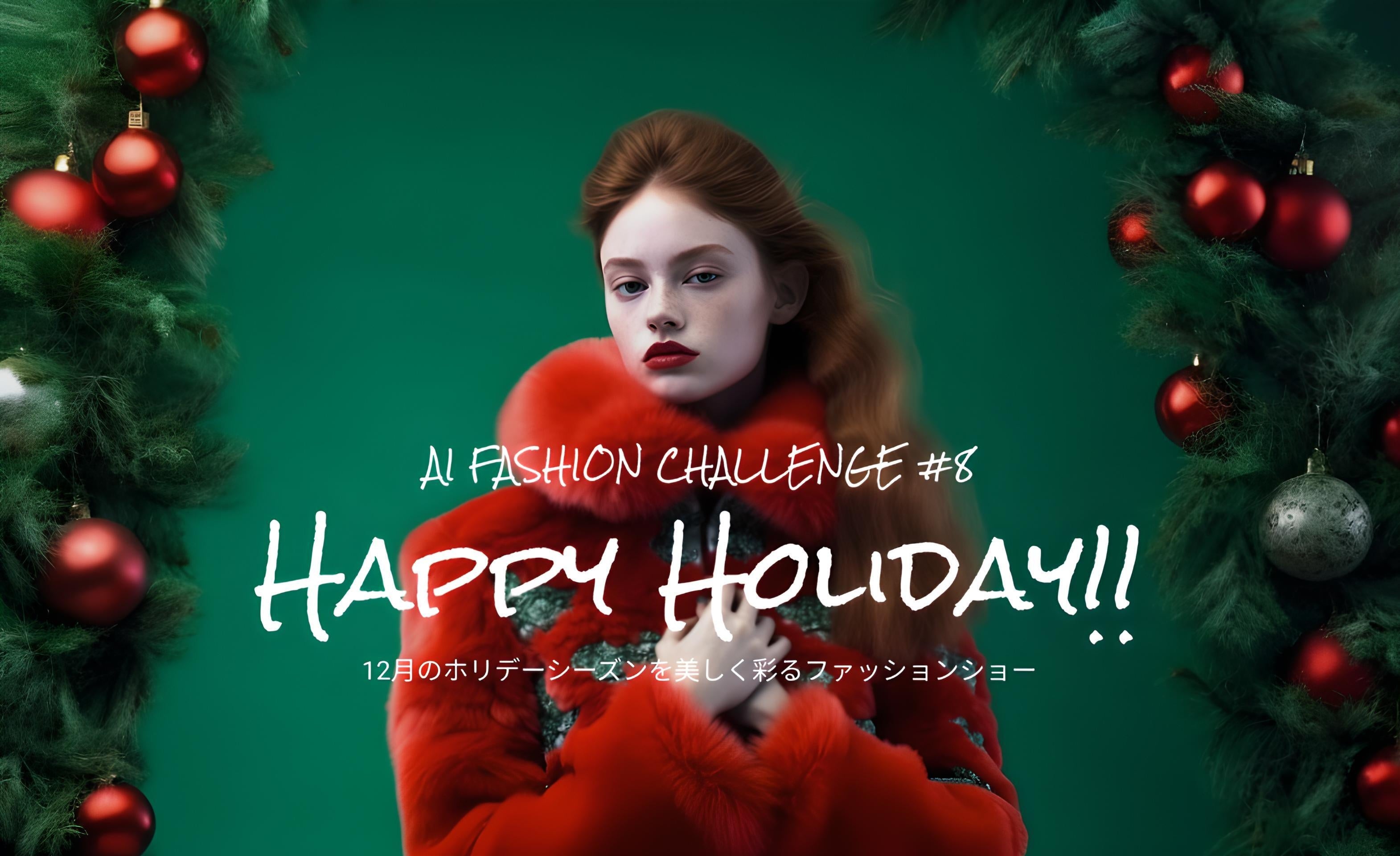 「AIファッションチャレンジ」第8弾のテーマは、「12月のホリデーシーズンを美しく彩るファッションショー」。「Midjourney(ミッドジャーニー)」をはじめとした画像生成AIでブランドテーマに沿ったファッションアイテムを生成し、OpenFashionのサークルに投稿するだけでご参加いただけます。